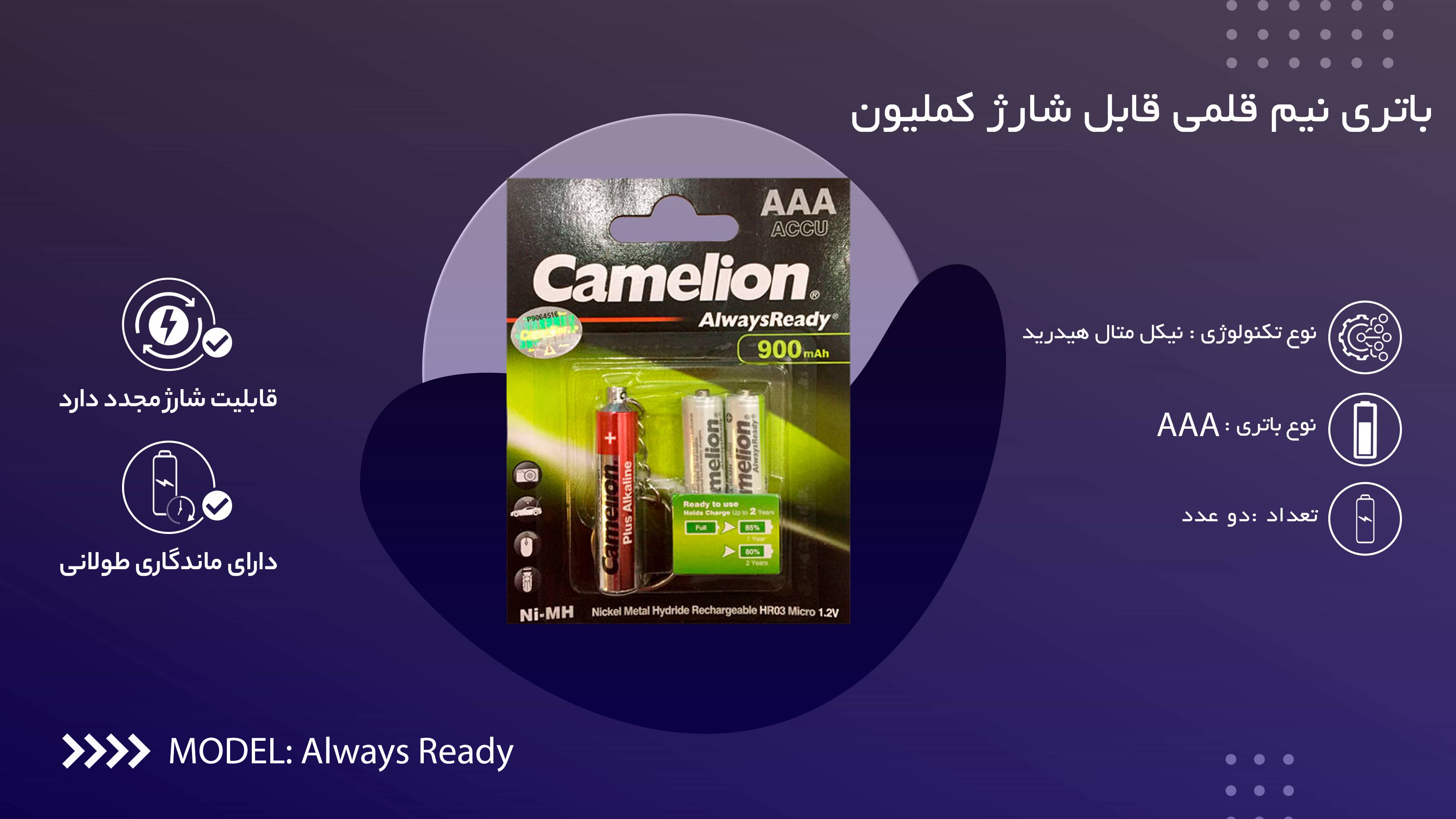 یکی از وسایلی که امروزه خیلی به کارمان میآیند، شارژرها و باتریها هستند. اکثر وسایل زندگی، از لوازمخانگی ساده گرفته تا دستگاههای هوشمند، برای تامین انرژی الکتریکی نیاز به باتری دارند. بعضی از باتریها قابل شارژ هستند و میتوان آنها را شارژ و چندین بار استفاده کرد و برخی دیگر، قابلیت شارژ مجدد ندارند. باتریهای معمولی و رایج انواع مختلفی چون باتریهای قلمی، نیم قلمی، سکهای، کتابی دارند. بسته به نیازمان میتوانیم هرکدام از آنها را تهیه کنیم. این دسته از باتریهای نیمقلمی کملیون بهصورت بستههای دوعددی تولید و عرضهشده است. اندازه آنها AAA یا نیمقلمی است؛ تکنولوژی ساختی که در تولید این نوع باتری بهکاررفته ، Ni-MH بوده و دارای پایداری انرژی الکتریکی و عمر مفید طولانی است. ظرفیت این مدل 900 میلیآمپر ساعت بوده و قابلیت شارژ مجدد دارد، پس طبیعتا میتوان پس از اتمام انرژی الکتریکی دوباره آن را شارژ و استفاده کرد. این مدل گزینهای مناسب برای تامین انرژی الکتریکی وسایلی مانند ساعت، اسباببازی، ریموت کنترل و دیگر دستگاههایی است که انرژی موردنیازشان را از باتریهای نیمقلمی تامین میکنند.