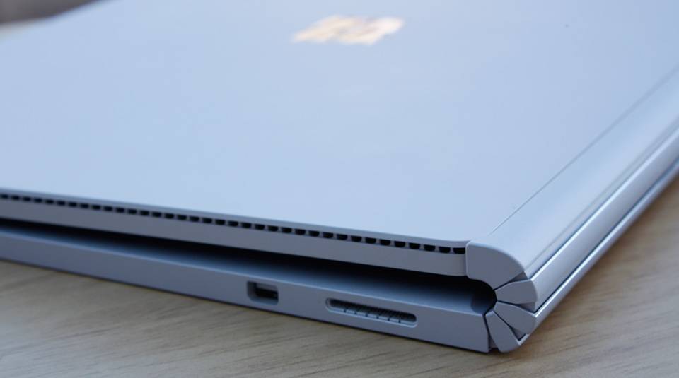حتی اگر در حالت لپتاپ، از قابلیت لمسی بودن صفحهی نمایش استفاده کنید هم، صفحهی نمایش لرزش نسبتا کمی خواهد داشت و اختلالی در کار شما ایجاد نمیکند. اما بزرگترین مشکل این لولا زمانی نمایان میشود که لپتاپ را میبندید. در حالیکه لبههای جلویی لپتاپ کاملا روی یکدیگر قرار گرفتهاند، در قسمت لبههای پشتی فاصله عجیبی بین صفحهی نمایش و بدنه ایجاد میشود و اینطور به نظر میرسد که لپتاپ هنوز کامل بسته نشده است. این طراحی نتایج ناخوشآیندی را به همراه دارد که در نگاه اول افزایش بیدلیل ضخامت بدنه دستگاه است. این نکته منفی به خصوص در هنگام جابجایی لپتاپ به چشم خواهد آمد و نمیتوان Surface Book را مانند دیگر لپتاپهای باریک در یک کیف کوچک یا کاور مخصوص آلترابوکهای 13 اینچی قرار داد و برای حمل آن باید از کیفها و کولههای مخصوص لپتاپهای معمولی استفاده کرد. بهعلاوه، این فضا محل مناسبی برای ورود گرد و غبار و کثیفی به بخشهای داخلی لپتاپ خواهد بود. از آنجایی که کلیدهای کیبورد و فضای اطراف آن رنگ روشنی دارد، نفوذ آسان این گرد غبار آزاردهندهتر هم خواهد شد. اما داستان اینجا تمام نمیشود و دیگر نکته منفی درباره این لولا این است که مثل بسیاری از دستگاههای هیبریدی جدید، از جمله Surface Pro 4، بدنه و صفحهی نمایش بهوسیله آهنربا به یکدیگر متصل نمیشوند و این اتفاق مانند محصولات قدیمی به صورت مکانیکی صورت میگیرد. به این ترتیب که وقتی شکافهای موجود در قسمت پایینی صفحهی نمایش را روی قفلهای موجود در دو طرف لولا قرار میدهید، این دو زبانه بهصورت مکانیکی داخل صفحهی نمایش قفل میشوند. برای جدا کردن این دو قسمت از یکدیگر هم، یک کلید در قسمت بالایی سمت راست کیبورد تعبیه شده است که با فشار آن به مدت حدودا یک ثانیه، قفلها آزاد شده و یک پیغام روی تصویر نمایش داده میشود که میتوانید صفحهی نمایش را جدا کرده و در حالت تبلت از آن استفاده کنید. جالب اینجاست که با وجود اینکه عملکرد مکانیکی این قفلها کاملا بیصداست، پس از فشار کلید جداسازی، صدایی شبیه به باز شدن قفل در از اسپیکرهای دستگاه پخش میشود تا حس باز شدن قفل دستگاه به خوبی به کاربر منتقل شود!
