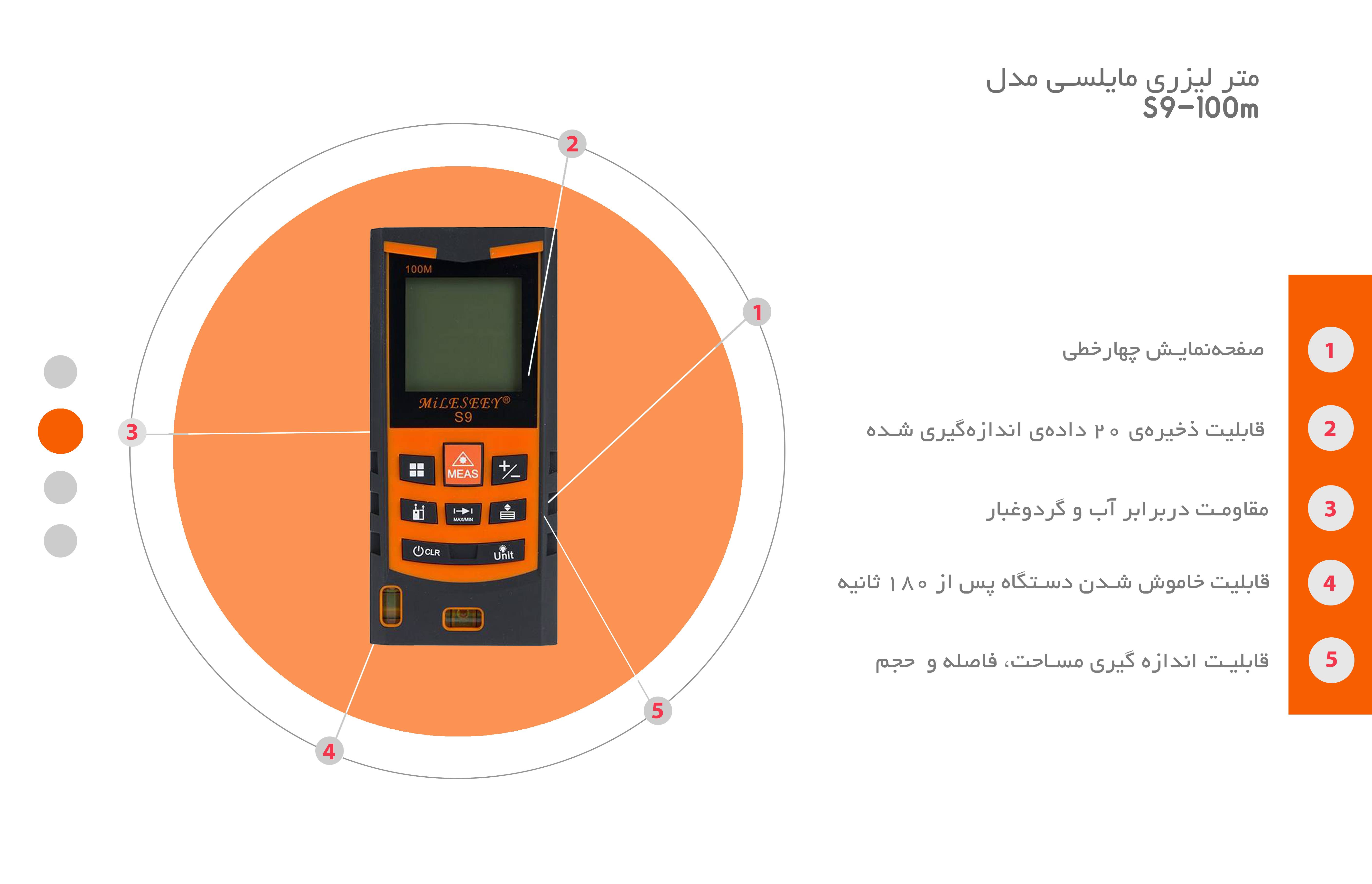 متر لیزری فوق یکی از محصولات تولیدی شرکت «مایلسی» (Mileseey) بوده که تحت عنوان مدل «S9-100m» به بازار عرضه می‌شود. استفاده از این متر مزایای زیادی دارد. با کمک این محصول می‌توان بدون کمک فردی دیگر، به‌راحتی مسافت موردنظر را اندازه‌گیری کرد. از سویی محدودیت‌های محیطی و دور از دسترس بودن نقطه‌ی موردنظر خللی در کار شما ایجاد نخواهد کرد. با کمک این محصول می‌توانید حداکثر مسافتی 100متری را اندازه‌گیری کنید. لیزر به‌کاررفته در این متر از نوع کلاس 2 بوده و دستگاه از دقت بالایی برخوردار است. این متر لیزری علاوه‌بر محاسبه‌ی طول برای محاسبه‌ی مساحت و حجم نیز مورد استفاده قرار می‌گیرد. دیگر مزایای این محصول عبارت است از: قابلیت اندازه‌گیری پیوسته، مقادیر بیشینه (ماکزیمم)، مقادیر کمینه (مینیمم) و عملیات جمع و تفریق. این متر لیزری قادر است مقادیر اندازه‌گیری‌شده را براساس واحدهای فوت، اینچ و متر نمایش دهد. با دراختیارداشتن این محصول بابت فراموش‌کردن مقادیر اندازه‌گیری‌شده نگران نخواهید بود. این متر می‌تواند 20 مقدار اندازه‌گیری‌شده‌ی پایانی را در حافظه‌ی خود ثبت کند. استفاده از این  محصول در محیط‌های مرطوب یا مملو از گردوخاک نیز بلامانع است؛ چراکه از استاندارد IP54 بهره می‌برد. شرکت مایلسی برای این متر 2 حباب تراز در نظر گرفته است تا کاربر در صورت امکان بتواند از زاویه‌ی مناسب قرارگیری متر روی سطح موردنظر یا حتی تشخیص شیب سطوح استفاده کند. این محصول انرژی موردنیاز خود را از 2 باتری نیم‌قلمی تامین می‌کند.