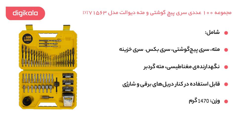 لوازم جانبی که برای ابزارهای دستی و برقی استفاده میشوند، بسیار متنوع هستند. این وسایل به افزایش کارایی دستگاه کمک شایانی میکنند. قصد معرفی مجموعهای از لوازم جانبی را برای شما داریم که محتویات آن در کنار ابزار دستی و برقی قابل استفاده است. مدل DT71563، مجموعهای 100 عددی است که انواع مته و سری پیچگوشتی در آن وجود دارد. این مجموعه را شرکت «دیوالت» (Dewalt) تولید و عرضه کرده است. استفاده از این محصول که محتویات آن در یک کیف ارگانیزه قرار گرفتهاند، بسیار آسان است. در یک طرف کیف، تعدادی مته قرار دارند که با کمک انواع دستگاه دریل قابل استفاده هستند. 13 مته مخصوص چوب، 12 مته مخصوص فلز و 3 مته برای سوراخکردن مصالح ساختمانی، 28 عدد مته موجود در این مجموعه هستند. در سمت دیگر کیف تعداد بسیار زیادی سری پیچگوشتی با اشکال سری مختلف قرار دارد. 60 سری پیچگوشتی با طولهای 25 و 50 میلیمتر، نیاز کاربر را در موارد بسیار زیادی تامین میکند. در کنار متهها و سریهای پیچگوشتی، 7 عدد سری بکس، یک نگهدارندهی مغناطیسی، یک سری خزینه و یک مته گردبر با دو سری 32 و 44 میلیمتری سایر اعضای این مجموعه را تشکیل میدهند. وقتی این مجموعه را جابهجا میکنید، خیالتان از بابت سالمماندن قطعات داخلی کاملا راحت باشد؛ زیرا تمام قطعات مجموعه در کیف ارگانیزهی قفلدار، کاملا محکم در جای خود قرار گرفتهاند.
