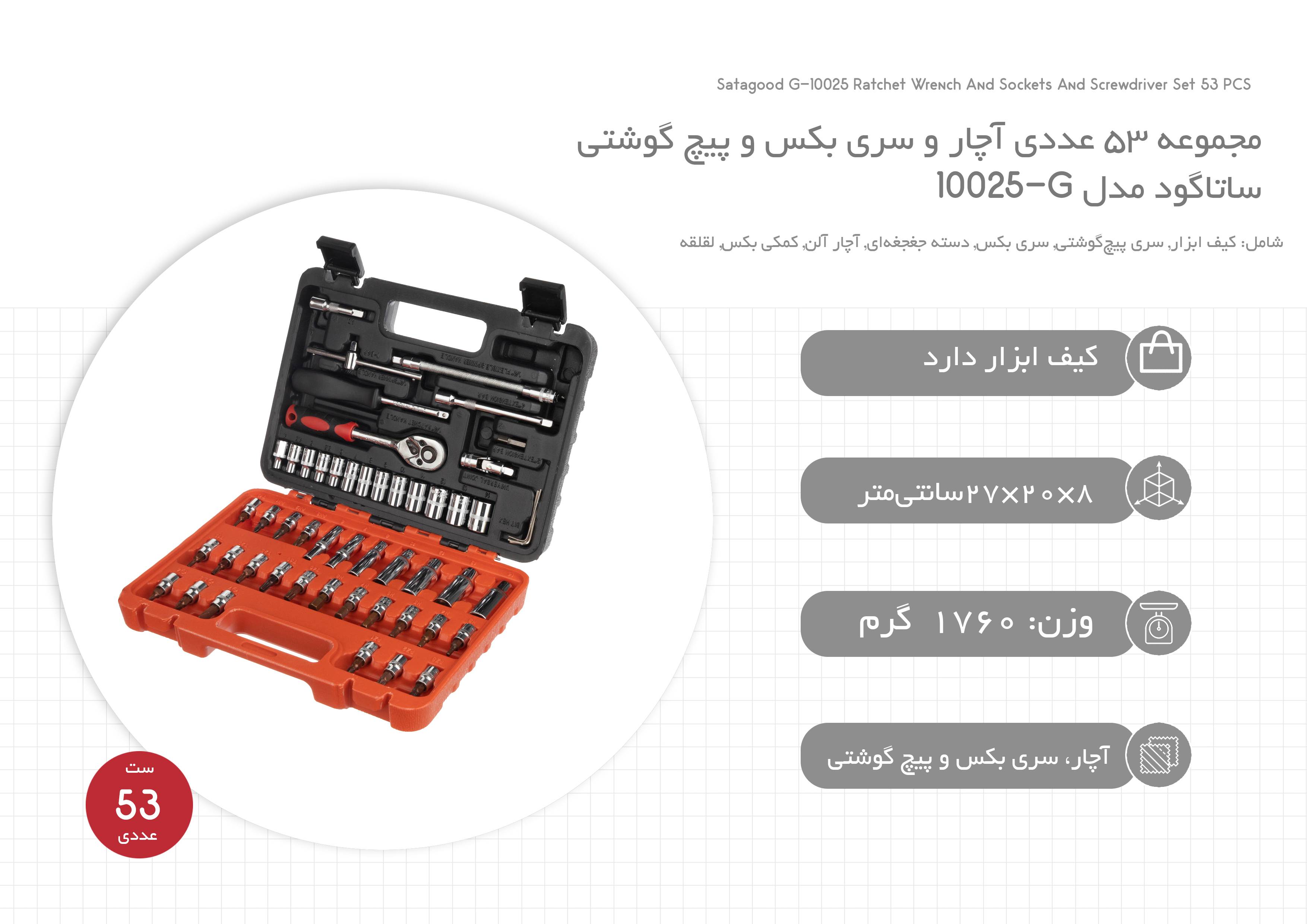 مشخصات کالاSatagood G-10025 Ratchet Wrench And Sockets And Screwdriver Set 53 PCS