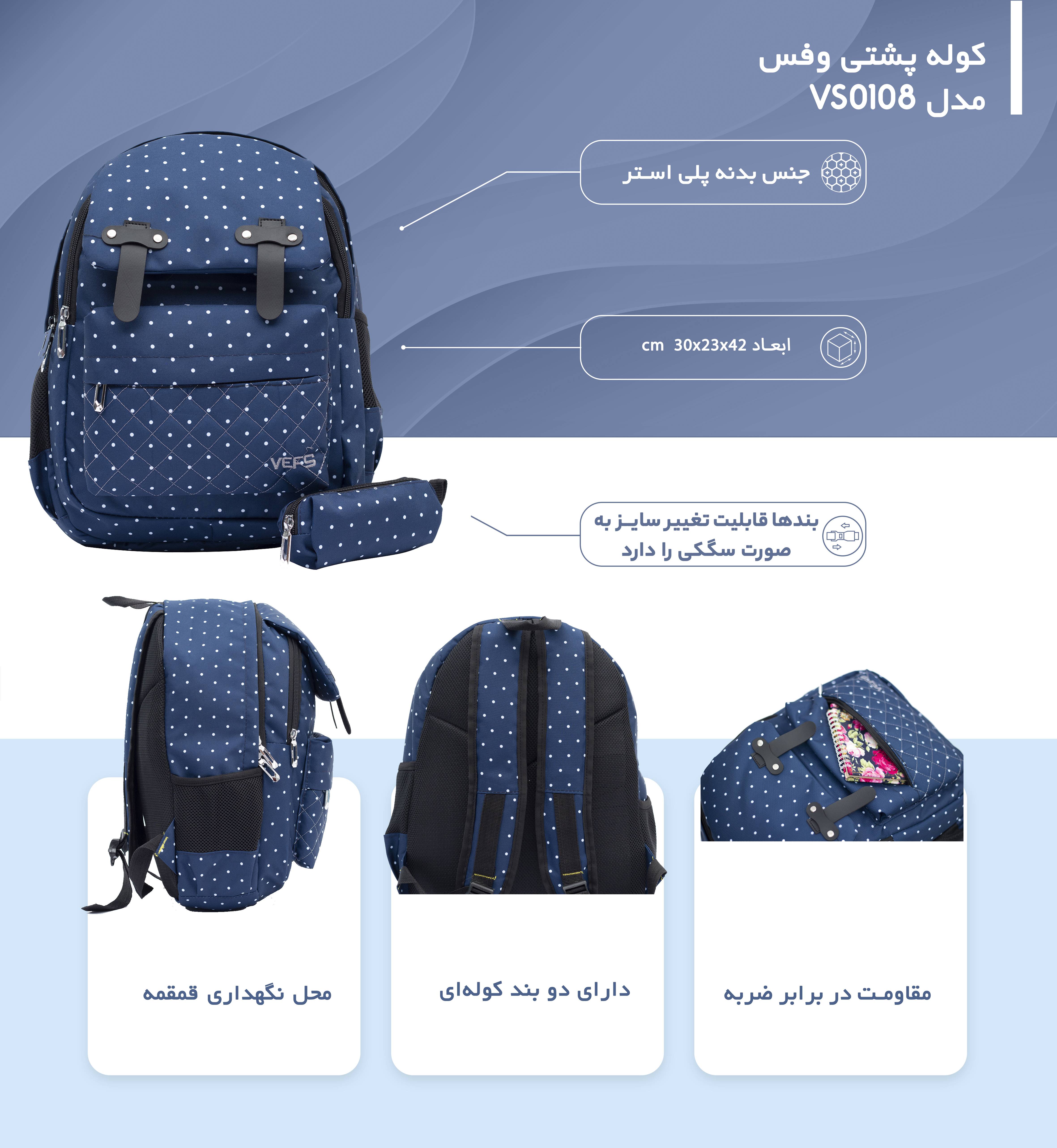 کوله‌پشتی یکی از وسایلی است که معمولا افراد برای حمل وسایل از آن استفاده می‌کند. کوله پشتی وفس مدل VS0108 باتوجه به زیبایی ، کیفیت و وزن سبک خود گزینه‌ی خوبی برای استفاده‌ی فرزندان شما خواهد بود. جنس بدنه از بهترین متریال حال حاضر در دنیا می باشد که مقاومت خوبی دربرابر پارگی و پوسیدگی دارد و همچنین ضدآب است. همین ویژگی پارچه باعث می‌شود که کوله‌پشتی از دوام و عمر خوبی برخوردار باشد و با خیالی راحت بتوانید برای مدت‌ها از آن استفاده کنید. ابعاد و اندازه‌ی درنظرگرفته‌شده برای این محصول نیز به حدی بوده که مناسب فرزندان شما باشد. برای حمل این کوله نیز سه دسته وجود دارد که یکی در بالا و دو بند دیگر در پشت قرار دارند. بندهای دوشی دارای قابلیت تنظیم هستند که باعث راحتی بیشتر در زمان حمل کوله‌پشتی می‌شوند. این محصول دارای دو جیب در طرفین کوله‌پشتی برای قرار دادن آب ونوشیدنی است. این کوله دارای دو جیب داخلی و سه جیب خارجی است. این کوله قابلیت شست‌و‌شو را نیز دارد.